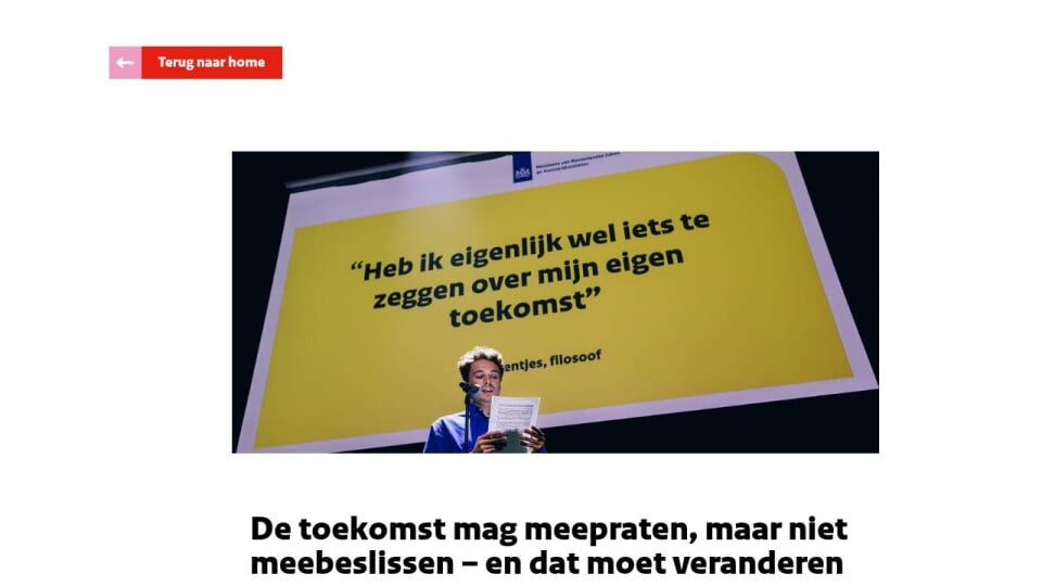 Het probleem is niet dat jongeren geen podium krijgen. Het probleem is dat betrokkenheid vrijblijvend blijft. De toekomst wordt uitgenodigd als gast, niet erkend als mede-eigenaar. Dat is geen detail, maar een democratisch tekort.