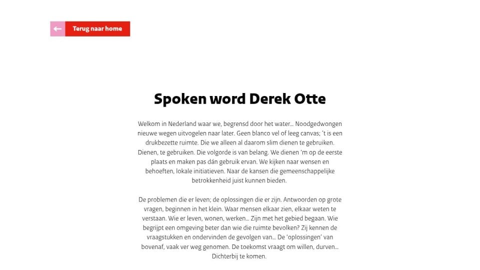 Welkom in Nederland waar we, begrensd door het water… Noodgedwongen nieuwe wegen uitvogelen naar later. Geen blanco vel of leeg canvas; ’t is een drukbezette ruimte. Die we alleen al daarom slim dienen te gebruiken. Dienen, te gebruiken. Die volgorde is van belang. We dienen ‘m op de eerste plaats en maken pas dán gebruik ervan. We kijken naar wensen en behoeften, lokale initiatieven. Naar de kansen die gemeenschappelijke betrokkenheid juist kunnen bieden.